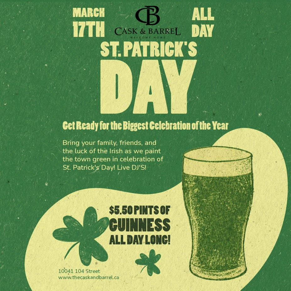 St. Patrickās Day Party at The Cask & Barrel! š Weāre opening early at 12 PM to kick off the celebration. Come raise a pint because Guinness pints are just $5.50 all day long. From 4ā9 PM (on the patio if weather permits), join us for big giveaways with our sponsor Guinness, plus great music, great people, and the best St. Patrickās Day vibes in the city. Grab your friends, wear your green, and celebrate with us! š»